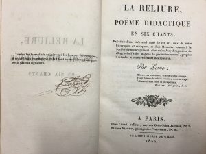 - LESNE. La reliure, poëme didactique en six chants. A Paris, chez Lesné, relieur, et chez Nepveu, 1820. In-8, [3] f., 246 p., reliure époque demi-basane violine, dos lisse orné d'un grand fer doré en long, titre, roulettes et filets dorés, tranches marbrées (coiffes lég. frottées, rousseurs ordinaires ; première garde annotée). Rare édition originale ; signature de l'auteur au verso du faux-titre.