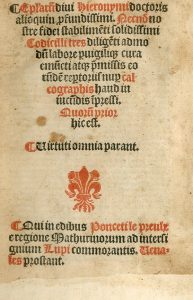 1re partie (sur 3).- Epistolarum divi hieronymi doctoris alioquin profundissimi. Necnon nostre fidei stabilimenti solidissimi Codicilli tres diligenti admodum labore privigilique cura emuncti... atque impressi. Quorum prior hic est [edidit Nicolaus Maillard Parisiis]. Qui in edibus Ponceti le Preulx e regione Mathurinorum ad intersignium lupi commorantis venales prostant [matériel typographique de Guillaume Le Rouge ?] : 1512 (la date ne se trouve pas dans cette 1re partie). Date à la fin de l'épitre dédicatoire de Nicolas Maillard : « Anno redemptionis nostre MCCCCCXII. XIX Kal. Januarias ».
