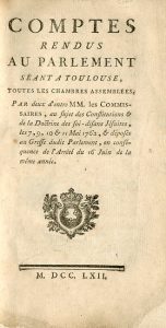 JÉSUITES.- COMPTES RENDUS AU PARLEMENT SÉANT À TOULOUSE, TOUTES LES CHAMBRES ASSEMBLÉES. Par deux d'entre MM. les Commissaires, au sujet des Constitutions et de la Doctrine des soi-disans Jésuites, les 7, 9, 10 et 11 mai 1762, et déposés au...