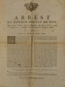 SEL DE VERRE de Verre.- "Arrest du Conseil d'Estat du Roy, qui permet l'Entrée dans le Royaume, du Sel de Verre venant d'Angleterre, en payant le Droit fixé par le Tarif de 1664 [...]