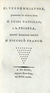 TANSILLO (Luigi). Il vendemmiatore, poemetto in ottava rima di Luigi Tansillo ; e la Priapea, sonetti lussutiosi-satirici di Niccolo Franco. A Pe-King, regnante Kien-long, nel XVIII. secolo [Paris, 1790],