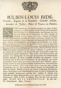 TRANSPORT DES GRAINS, FARINES ET PAINS.- Ordonnance de Julien-Louis Bidé, Seigneur de Grandville, Intendant de Justice, Police et Finances en Flandres. "avons donné pouvoir aux Cavaliers de la Maréchaussée, aux Commis des Fermes des Estats de la...