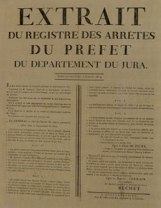 Au nom des puissances alliées, désarmement de la population par ordre du Maréchal Prince de Schwarzenberg, daté de Troyes, le 10 mars.- 3. 31 mars 1814. Nouvelles de l'armée : occupation de Paris, Vive le Roi, vive les Souverains alliés, Déclaration de l'Empereur de Russie.- 4. 24 mai 1816. Appel au calme des braves Jurassiens, suite à la rebellion de Grenoble. Vignette aux armes royales (manque au bord gauche).