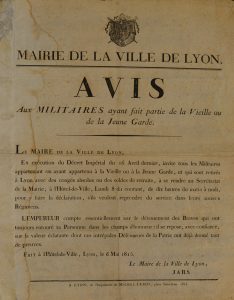 Le Préfet du Département de la Charente aux sous-officiers et soldats de la Vieille Garde Impériale : "Soldats, l'Empereur fait un appel [à ceux] qui voudraient reprendre du service. [...] Sa Majesté veut que ses armées la voient entourée des braves qui l'entouraient à Lutzen, Bautzen...[...]". Imprimé à Angoulème.- 2. ...1814 (fin de la campagne de France). Avis aux militaires qui ont servi dans la Garde Impériale. "Sa majesté l'Empereur invite tous les militaires qui ont servi dans la Garde Impériale à reprendre du service [...] jusqu'au moment ou l'ennemi aura été chassé du territoire français [...]". Imprimé à Montbrisson.- 3. 5 et 11 mai 1815. Proclamation aux marins, ouvriers et soldats des troupes de la Marine : "Français, la Patrie réclame vos services, l'Empereur vous appelle à la secourir [...]". Imprimé à Angoulème (petits trous de vers).- 4. 24 mai 1815. Corps d'observation des Pyrénées. Ordre du jour : appel au patriotisme, menace aux opposants... Imprimé à Angoulème sur papier vert pâle (2 taches). Vignette à l'aigle.- 5. 6 mai 1815. "Mairie de la Ville de Lyon. Avis aux Militaires ayant fait partie de la Vieille ou Jeune Garde [...] L'Empereur compte essentiellement sur le dévouement des braves qui ont toujours entouré sa personne dans les champs d'honneur [...]". Imprimé à Lyon (mouillures).