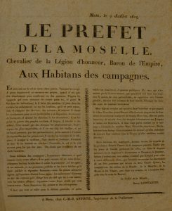 Metz. Avis : "En vertu des ordres de l'Empereur [...] création de 5 Compagnie de Sapeurs-ouvriers pour les travaux de défense de la place [...]. Grande vignette impériale (quelques manques sur les bords).- 2. 27 juin 1815. Ordre du jour de la Garde Nationale de Metz. Appel à tous les Gardes Nationaux pour sauvegarder la ville "comme au blocus de 1814".- 3. 9 juillet 1815. Le Préfet de la Moselle aux habitants des campagnes : "[...] En arrivant sur le sol de notre chère patrie, l'ennemi la ravage [...] Bons habitants des campagnes, écoutez encore les conseils de la prudence, bientôt l'heure de la vengeance sonnera [...]. Message pressant pour opposer de la résistance à l'ennemi.- 4. 28 juin 1815. Proclamation du Commandant en chef de l'Armée de la Loire, le Général Lamarque aux habitants de l'Ouest : "La Paix que le gouvernement m'avait autorisé à proposer à MM. les chefs de l'Armée vendéenne, a été signée [...] Le sang français ne coulera plus par les mains des Français [...]". Tout le texte est relatif à la pacification de l'Ouest. Imprimé à Angers. Vignette à l'aigle.