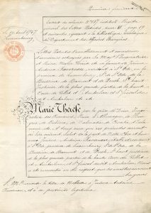 des lettres patentes d'annoblissement accordées par l'Impératrice Marie-Thérèse d'Autriche en faveur de Jérôme Antoine Favereau, sieur de St Ode, de la Boissine, de Bamont et de Presle. 8 pages 4°, sceau à sec du Ministère et armoiries peintes à la main.