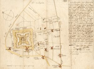 Plan manuscrit daté de 1698 du fort Pereira et de ses environs. A droite du plan, notice manuscrite signée "Joan Carel van Zij...", qui signale que le plan a été dessiné "naer van originele caerte berust onder den provisor van St Michiels". Dim. : 39,5 x 30 cm (traces de pliures). "C'est probablement à la suite de la victoire de Spinola sur la flotte hollandaise en mai 1605 que l'on construisit le fort de Dam ou Pereyra, ouvrage élevé dans le but de couvrir la ville du côté Nord et qui du temps de l'Empire français, fut relevé sous le nom de fort Carnot" (Génard, Anvers à travers les âges, II, 92).