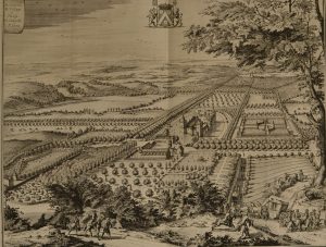 BOUCHAUT.- "Prospectus castelli Bouchaut Domini Petri Ferinandi Roose Baronis de Bouchaut [...]. Belle vue gravée sur cuivre du 18e siècle du château de Bouchaut, avec des cavaliers et des carrosses dans un paysage champêtre à l'avant-plan.
