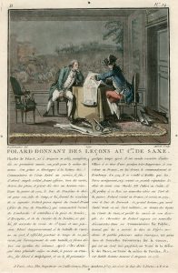 "FOLARD DONNANT DES LEÇONS AU Cte de SAXE". Gravure en couleurs sur cuivre du 18e siècle dessinée par Desfontaines et gravées par Moret, représentant le Chevalier de Folard et le Maréchal de Saxe, assis à une table, discutant d'un plan de...