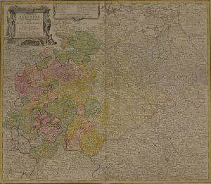 Carte gravée sur cuivre du 18e siècle avec un cartouche gravé, mise en coloris. Dim support : 53 x 63,5 cm ; sujet : 47,5 x 55 cm ( bords effrangés).