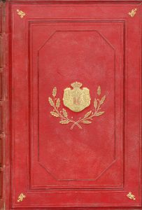 in-folio, LXXVI-112 p., (ex. interfolié), plein chagrin rouge de l'époque, dos à 5 nerfs orné d'aigles couronnés dorés, auteur et titre dorés, armes dorées au centre des plats entourées d'une branche de chêne et d'une de laurier, aigle couronné doré dans les coins, 8 filets à froid d'encadrement, grecques dorées sur les coupes, dentelle à froid sur les contreplats, tranches dorées (qq. rousseurs, mors fendillés sur 4 cm) (reliure signée A. Despierres, relieur de l'Empereur). Envoi : "A son Excellence Monsieur le Comte Walewski, Ministre des Affaires Etrangères. Hommage de la profonde gratitude et du respectueux dévouement de l'auteur. Henri d'Escamps. Paris, 5 janvier 1859". Alexandre Colonna, comte Walewski, né le 4 mai 1810 au château de Walewice (Pologne) et mort le 27 septembre 1868 à Strasbourg, est un militaire, diplomate et homme politique franco-polonais. Ministre et sénateur sous Napoléon III, il est par ailleurs connu pour être le fils naturel de Napoléon Ier. Henry d'Escamps (1815-1891) est né à la Guadeloupe, il fut présenté à Victor Hugo à l'âge de dix-huit ans et devint l'un de ses fidèles. C'est à lui, "jeune homme", qu'est adressé le poème XIII des "Voix intérieures". Au moment du coup d'État il agit comme un "ami sûr et vrai" que Hugo remercie dans une lettre datée de Bruxelles le 14 décembre 1851. Auteur d'un ouvrage historique et géographique sur Madagascar, il fut chargé de diverses missions par le ministère des Affaires étrangères avant d'être nommé inspecteur des Beaux-Arts en 1862. Très rare. Ex. sans planches identique à celui de la Bnf.