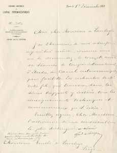 adressée à M. Emile de Laveleye à Liège (1 p. 4° sur papier à en-tête de la Compagnie Universelle du Canal Transocéanique [canal de Panama]. Il envoie à son correspondant "[...] le compte rendu des séances du Congrès international d'études du Canal interocéanique, pour faciliter les recherches de M. votre fils, qui trouvera, dans les divers Rapports y insérés, tous les renseignements techniques et commerciaux qu'il désire [...]".