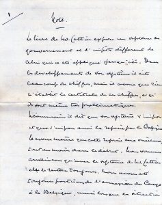 "[...] M. Cattier oublie complètement que la création du Congo a été une oeuvre personnelle dans sa conception, personnelle dans les sacrifices qui ont été faits pour la réaliser. Le fondateur du Congo a toujours annoncé que le Congo était fondé dans l'intérêt de la civilisation et de la Belgique [...] Que le Congo lui appartienne, cela n'est contesté par personne, puisque personne n'a contesté le droit dont il a fait usage de le léguer par testament à la Belgique (6 pages 4°).