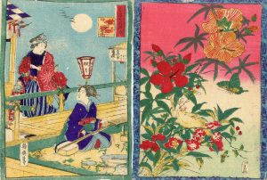 DEUX SCÈNES DE GENRE ET UNE NATURE PAPILLON ET OISEAU. Lot de trois estampes "chirimen-e" (crépon), fin 19e siècle - qu'affectionnait Van Gogh (The Van Gogh Museum of Japanese Prints Catalogue, 1991).