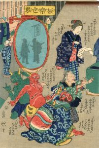 HIROKAGE (actif de 1855 à 1865). Triptyque satirique. Evocation du tribunal des enfers. Format oban.