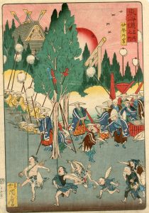 Autel à l'extérieur du temple d'Ise (Ise Geku). Cette série de la route du Tokaido s'appelle aussi « série de la procession du Tokaido » et correspond au déplacement du shogun Iemochi d'Edo à Kyoto, répondant à la convocation de l'empereur, le deuxième mois de l'an 1863. Cette estampe commémorative est donc éphéméride.