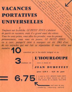 Placard 4° imprimé sur papier rose qui annonce la sortie du n° 10 de "Le Petit Jésus" constitué par le fac-similé intégral et en 3 couleurs de l'Hourloupe de Jean Dubuffet (été 1963).