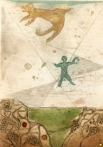 ortfolio de 4 eaux-fortes originales en couleurs titrées, signées et justifiées 66/99, farde en toile brune édit. (le portfolio n'est pas num.). Comprend : "L'Apesanteur", "Grâce étrusque", "La Barque de l'au-delà", "L'Extra-terrestre" (Catalogue raisonné, n° 670 à 673).