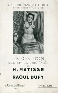 plaquette in-12, agrafée./ "Fifth International Exhibition of Lithography and Wood Engraving". Chicago, The Art Institute, 1935-36, plaquette 8°, agrafée. Estampes de Derain, Survage, Molnar, Lébédeff, etc./ Exposition d'estampes originales de H. Matisse et Raoul Dufy. P., Galerie Marcel Guiot, 1933, 8°, 4 p., 2 ill./ Carton d'invitation pour l'exposition "Les Fauves" à la Galerie de France du 13 juin au 11 juillet + liste des prix./ Ens. 4 pièces.