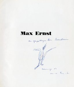 Max Ernst. P., Pauvert, 1958, 8° carré, 443 p., toile édit. Ex. dédicacé et enrichi d'un dessin au stylobille et aux crayons de couleurs par Max Ernst. On joint le carton d'invitation pour le vernissage de l'exposition organisée par La Hune pour la sortie du premier livre de Waldberg consacré à la vie et à l'oeuvre de Max Ernst en janvier 1959.