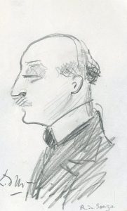 Dim. : 10,4 x 6,5 cm. D'après une note manuscrite sur une enveloppe jointe, le croquis aurait été pris au déjeuner de l'association internationale des écrivains de langue française (janvier 1933). Robert de Souza (1864-1946) est un poète symboliste français, disciple de Stéphane Mallarmé, théoricien du vers librisme, collaborateur à de nombreuses revues littéraires.