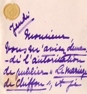 (3 pages in-12, cachet à la cire). "Monsieur, Vous m'aviez demandé l'autorisation de publier "Le Mariage de chiffon" [publié en 1894] et je vous avais dit qu'il fallait attendre que le roman eût été édité. Il a paru hier, et vous êtes libre de le publier à présent [...]".