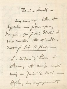 (3 pages in-12). "[...] L'audition d'Eve [Ève est un oratorio de Jules Massenet sur un livret en français de Louis Gallet, créé au Cirque d'été à Paris le 18 mars 1875] à Anvers est remise aussi mais au jeudi 2 mai. Hélas, mes engagements à Londres m'obligent à renoncer à mon voyage à Anvers car je ne puis faire changer les jours du festival au Crystal Palace. Ne m'oubliez pas alors que vous recommencez vos splendides concerts [...]".