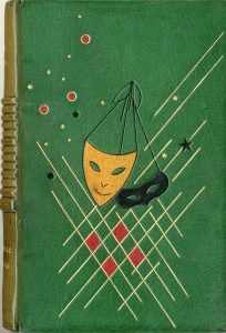 in-12, plein maroquin vert, dos à 13 nerfs contigus, auteur et titre dorés, plat supér. orné de 2 masques de carnaval mosaïqués en maroquin brun et noir, sumontés de pastilles serties de filets dorés et d'étoiles dorées, dans la partie infér. filets dorés en oblique en croisillons, contreplats bordés sur 3 côtés avec 1 filet doré, tête dorée sur témoins, couv. cons. reliée en fin de vol. (une partie du dos manque), étui (dos passé). Les Bals des Quat-z-arts. Vache enragée. Bals du Courrier. Boeuf gras. Cortèges des Etudiants. Cortèges du Moulin-Rouge.