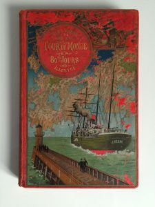 Jules VERNE : Tour du monde en 80 jours Cartonnage au Steamer, H.T.polychrome, 1892-1905.