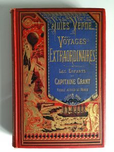 Jules VERNE : Les enfants du capitaine Grant. Cartonnage rouge « à la bannière » bleue type 2 (collection J. Hetzel sur la bannière), (1876-1878),