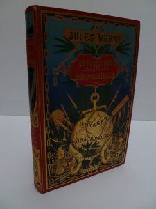 Jules VERNE : Une ville flottante/Aventures de 3 russes et de 3 anglais. Cartonnage au globe doré (1896-1914), dos à l'ancre, catalogue 1899 in fine.