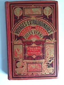 Jules VERNE : Le docteur Ox - Le tour du monde en 80 jours. Cartonnage rouge aux deux éléphants type 3, second plat Lenegre type « e », (1884-1889),