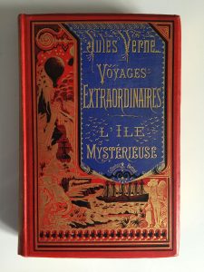 Jules VERNE : L'île mystérieuse. Cartonnage rouge à bannière bleue type 6 (collection J. Hetzel sur la bannière), plats biseautés, second plat Lenegre « e1 », (1884).