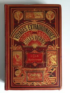 Jules VERNE : L'île mystérieuse. Cartonnage rouge aux deux éléphants type 1, dos marqué Engel et fils relieurs, (1876)