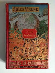 Jules VERNE : L'île mystérieuse. Cartonnage au dos à l'encre, second plats Engel « i », (1903-1914).