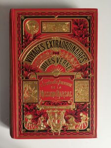 Jules VERNE : L'étonnante aventure de la Mission Barsac. Cartonnage à l'éventail titre dans l'éventail et un éléphant, Hachette (1919),
