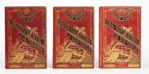 Jules VERNE : La découverte de la terre; Cartonnage rouge à la sphère armillaire ptolémaïque, second plat Engel type « b » (1875-1880),