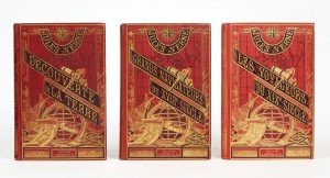 Jules VERNE : La découverte de la terre, Cartonnage à la sphère armilliaire ptolémaïque de couleur rouge, second plat Engel type B,