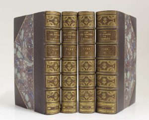 4 volumes In-12° - Bien complet des 11 eaux-fortes de Flameng, dont un portrait de Boccace, suivies d'1 suite sur Chine - Exemplaire avec la suite en double épreuve : avec et avant la lettre - Belle reliure de l'époque demi-maroquin violine à coins (signée de Canape) - Dos à nerfs joliment ornés de motifs floraux dorés et de cuir incisé, titrés, tomés et datés or (passés uniformément) - Têtes dorées - Couvertures conservées - Tome I : petit manque de cuir entre la coiffe inférieure et le mors du 1er plat, tome III : Coin supérieur du 2nd plat émoussé - 1 des 600 exemplaires sur Hollande - Bel ensemble.