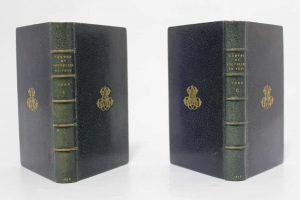 2 volumes In-12° - 2 portraits aux titres et 44 fines gravures en tête de pages - Reliure de l'époque plein maroquin marine (signée Fock fils) monogrammée or aux plats - Larges dentelles intérieures dorées - Dos à nerfs titrés et datés or (uniformément passés et légèrement frottés aux nerfs) - Ex-libris répétant le monogramme des plats - Tranches dorées - Bel exemplaire.