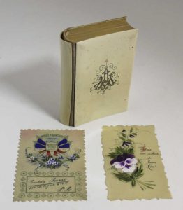 1 volume In-16° - Frontispice gravé - Ouvrage truffé de quelques images pieuses - Précieuse reliure de l'époque en ivoirine, 1er plat incrusté d'un monogramme (A M) bombé, fait de métal et de petits points de nacre (1ère charnière largement fendue et discrètes traces de fermoirs) - Dos (muet) arrondi en ivoirine - Tranches dorées.