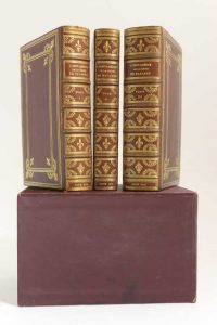 3 volumes petit In-12° - 1 portrait et 12 dessins in texte en noir de Sahib - Elégante reliure de l'époque maroquin bordeaux signée Bretault - Plats encadrés d'1 triple filet doré avec fleurons aux angles et d'1 second triple filet doré central, fleurdelisé aux angles - Large dentelle intérieure - Dos (infimement passés uniformément) à nerfs richement ornés, fleurdelisés et datés or (1 frottement en coiffe supérieure du tome I) - Couvertures vélin conservées - Tirage à 500 exemplaires sur vergé - Très bon exemplaire non rogné dans coffret de percale bordeaux - Ex-libris manuscrit à l'encre à la 1ère garde du tome I : Cte de la Revelière.