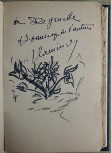 1 volume In-12° - Portrait hors texte de Vlaminck d'après Derain et 16 phototypies hors texte en noir - Reliure légèrement postérieure chagrin bleu sous étui marbré - Dos lisse titré or - Couvertures conservées - Exemplaire enrichi d'1 dessin signé de Vlaminck à l'encre bleue à l'1 des gardes envoyé à Degruelle avec hommage de l'auteur et d'1 plaquette d'1 exposition Vlaminck In-12° agrafée (texte séparé) avec envoi signé et daté de l'auteur au même Degruelle - Edition originale numérotée sur Alfa - Très bon exemplaire.