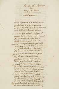 Jérusalem du Tasse traduite en vers français par Monsieur de Roquetaillade mon père. C’est ici l’original » (note autographe de Scipion du Puy sieur de Roquetaillade et d’Escalibert). Manuscrit en français sur papier, 132 ff. in-folio à l’italienne écrits au recto et au verso, précédés d’un f. in-12 portant le titre, rel. plein vélin blanc (reliure moderne, quelques feuillets soigneusement restaurés). On a de plus relié dans l’exemplaire une lettre autographe signée de l’auteur, non datée, adressée à Monsieur d’Escalibert son frère en quatrième page. Important manuscrit, avec de nombreuses corrections également autographes, témoignant de la pénétration de l’italianisme baroque dans les cercles littéraires du Sud-ouest de la France, et en particulier ici dans les cercles protestants (pendant la première moitié du XVII e siècle). L’auteur avait joué un rôle politique et militaire non négligeable dans l’entourage du comte d’Orval, fils de Sully. Le texte de ce chef d’œuvre de la littérature italienne de la Renaissance, paru en italien en 1581 puis en version définitive, remaniée, en 1592, a été traduit et publié en français d’abord par Blaise de Vigenère (né à Saint Pourçain sur Sioule en 1523) dès 1595, ensuite par J. Baudouin (plusieurs éditions à partir de 1626), et enfin, dans la seconde moitié du XVII e siècle, par Vincent Sablon, avant de l’être par de très nombreux écrivains pendant les XVIII e et XIX e siècles. La version française présentée ici, datant de la fin du premier tiers du XVII e siècle, est donc une des toutes premières, la seconde ou la troisième selon qu’elle précède ou suit celle de J. Baudouin et elle est apparemment restée inédite. Se pose alors la question, devant cette traduction, de la valeur symbolique, pour une population chrétienne opprimée (les protestants) de la délivrance de Jérusalem. Joint : - La Ierusalem délivrée du Torquato Tasso. Manuscrit en français sur papier, en vers, 21 pp. in-4 et 5 pages blanches, s.l.n.d. (vers 1660) : copie autographe très soignée, non signée, par Scipion du Puy sieur d’Escalibert, de la traduction du premier chant de l’œuvre du Tasse par son père. - Préface sur la Jérusalem Delivrée et Epitre dédicatoire au Duc Emmanuel de Savoye sur la Jérusalem Délivrée, 1 fevr. 1581, 6 pp. et 3 pp. in-4, manuscrits en français sur papier, fin du XVII e ou début du XVIII e siècle.