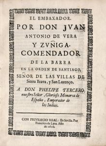 VERA. El embaxador por Don Juan Antonio de Vera y Zuniga Comendadot de la Barra en la orden de Santiago, Senor de las villas de Sierra Brava, y San Lorenço. A don Phelipe Tercero. Sevilla, Francisco de Lyra, 1620,