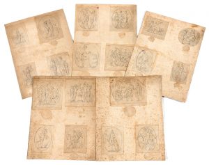[POMPADOUR (Mme de)]. - VIEN (Joseph-Marie) entourage de. Ensemble de cinq feuilles d'études donnant dix-neuf camées, avec sous chaque projet la forme ovale ou ronde de l'intaille.