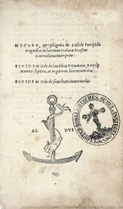 EURIPIDE. Hecuba, & Iphigenia il Aulide, tragoediae. Ode de laudibus Britanniae. Ode de senectutis incommodis. S.l.n.d. [au colophon] : Venise, Alde, décembre 1507.