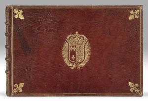 In-4 oblong, maroquin rouge, triple filet doré, armoiries dorées au centre, grande fleur de lis aux angles, dos orné avec compartiments décorés d'un semé de fleurs de lis, roulette intérieure, tranches dorées (Reliure de l'époque).