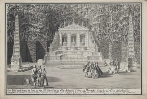 Parmi ceux-ci se trouvent 9 vedute montrant la Cascade rustique à Marly, l'arc de triomphe dans les jardins du roi, la Volièrre dans la ménagerie à Versailles, le Buffet d'eau ou Cascade de Trianon, le Prospect du bosquet des trois Fontaines, la Sale du Bal dans les jardins de Versailles, etc.