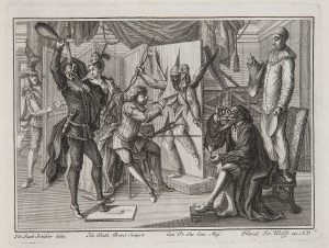 12 grandes et remarquables figures à mi-page, en premier tirage, représentant des scènes burlesques et des intrigues amoureuses de la Commedia dell'Arte, gravées sur cuivre par Johann Balthazar Probst d'après les compositions de Johann Jakob Schübler.